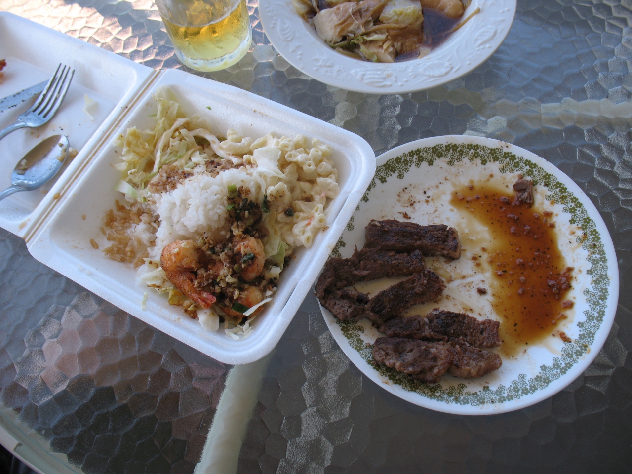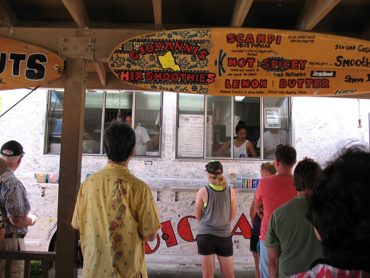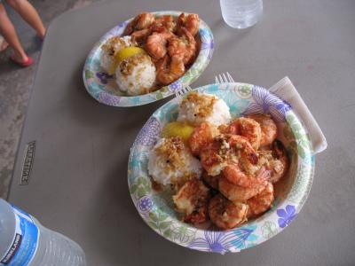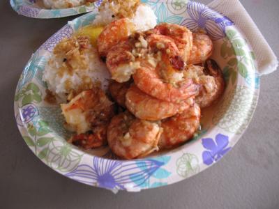 オアフ周遊の時は絶対ここに立ち寄ることにしています。一昔前はおんぼろのワゴンシュリンプ店でしたが、ガイドブック等の影響か平日でも結構混んでいます。施設も年を経るにしたがって立派になってきました。値段がすこしづつ上がってきているような気がしますが、味はプレートランチとしては上々でしょう。この味に近いのを日本に帰って食べたい諸氏はドンキーやフードランドなどにあるMINATOのハワイアンスタイルシュリンプマリネとして瓶入りで売っていますので試されてはいかがでしょうか。