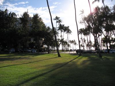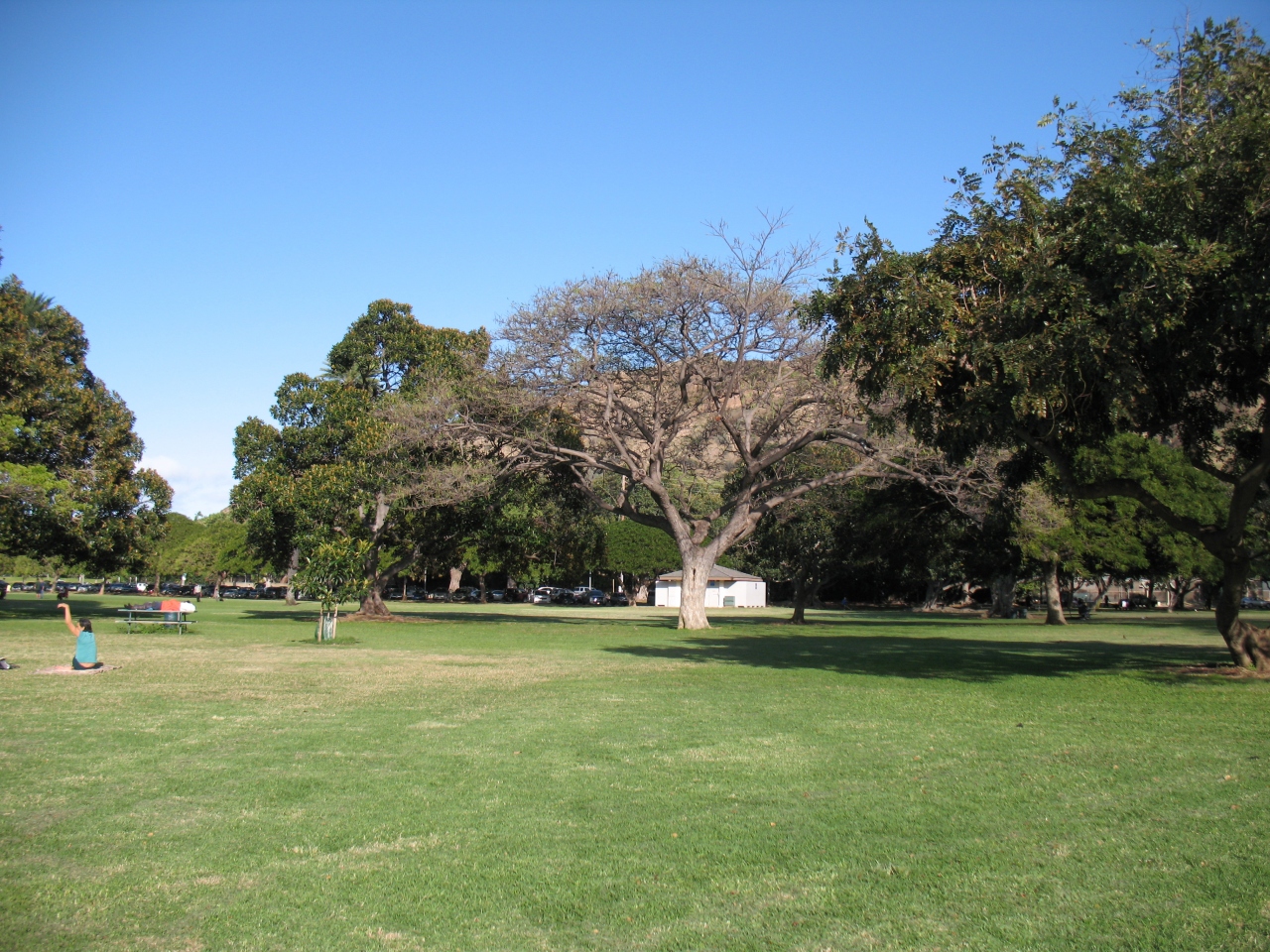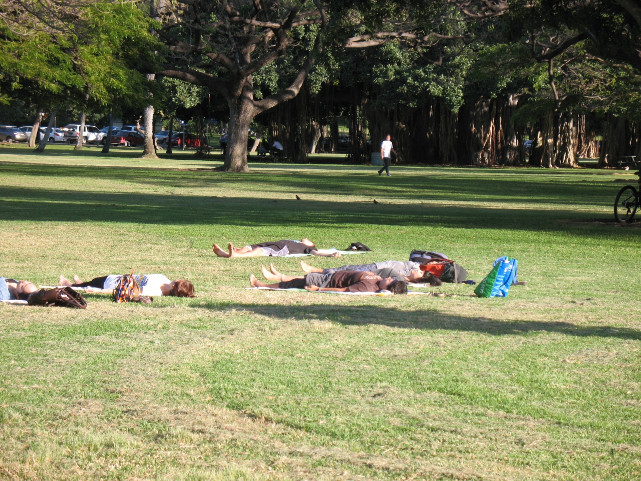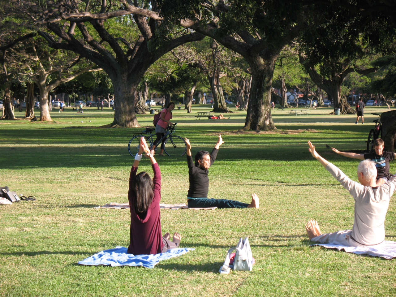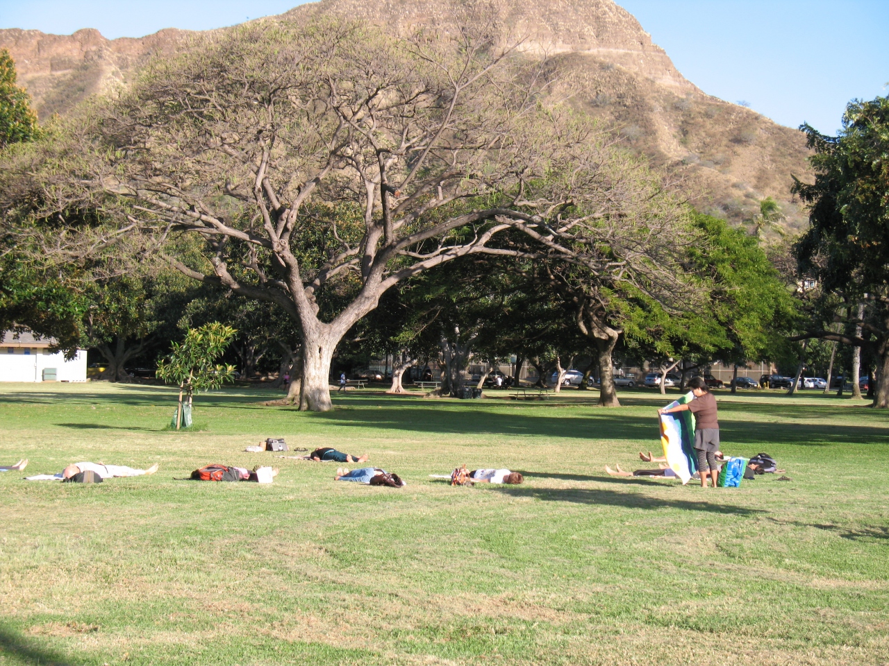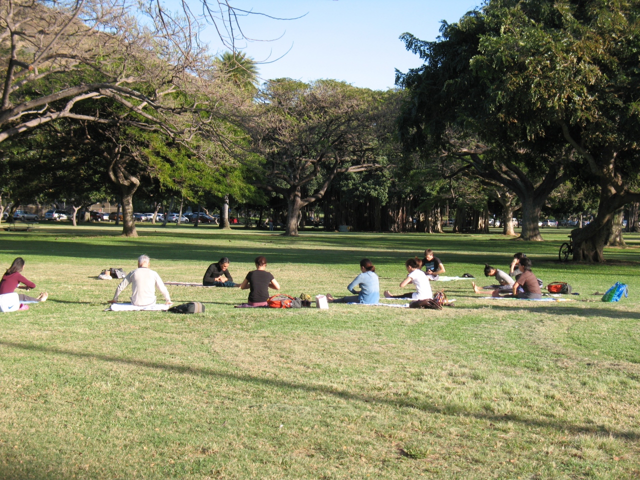 ダス先生という方がカピオラニ公園内で無料のヨガのレッスンをやっているとことで行ってみました。口コミの情報は公園の東側Y字の木の近くというだけで探すのには苦労しました。