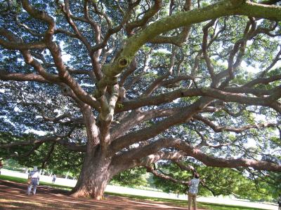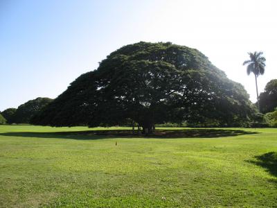 ワイキキからHIにのり途中支線であるMoanalua Fwy(78号線)に入りExit3で降りるとすぐ右側にそれらしき公園がありますので、ほぼ迷わないと思います。レンタカーだと30分程度で着きます。この木だけではなく公園全体を散策してください。雨期にはぬかるみができますので、雨の翌日等は履物に注意が必要です。