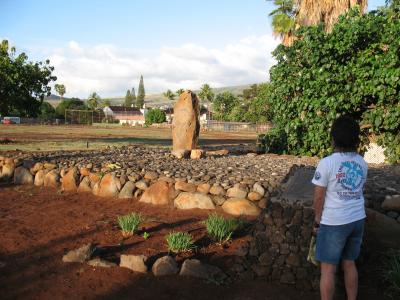 ラハイナ(灼熱の太陽というらしい)の中心部から5分ほど東に歩くとラハイナショアーというコンドの斜め前に公共駐車場があります。その隣がマルウル・オ・レレパークです。パークの右端にひっそりと石碑が立っています。ここはかつてフィシュポンドでその中にモクウラという小島があり、カメハメハ三世がそこに王室を置かれ、マナの宿る聖地だそうです。今はただ写真のような石碑があるだけです。隠れたパワースポットなのです。是非立ち寄ってみましょう。