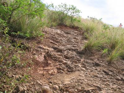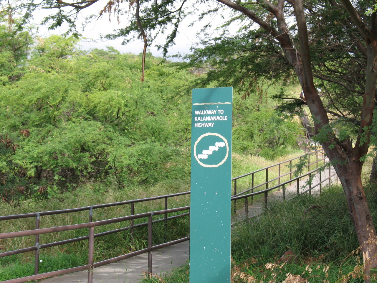 アロハ瓦版の近藤純夫氏が書かれているように多くの方が登られている山はココクレーター(368m)で正式にはココクレーターサミット オールド レイルウェイトレイルだそうです。皆さん覚えておきましょう。今回のトレイルは地域公園内にある本物のココヘッド(196m)の頂上付近にある電波塔を目指すコースです。ハナウマベイの駐車場に車を止め(満車の場合は下まで引き返しハワイカイからココヘッドディストリクトパークの駐車場に停めます)階段を登り、ハナウマベイ入口にある登ってきた左側の閉ざされた門の間から登っていきます。