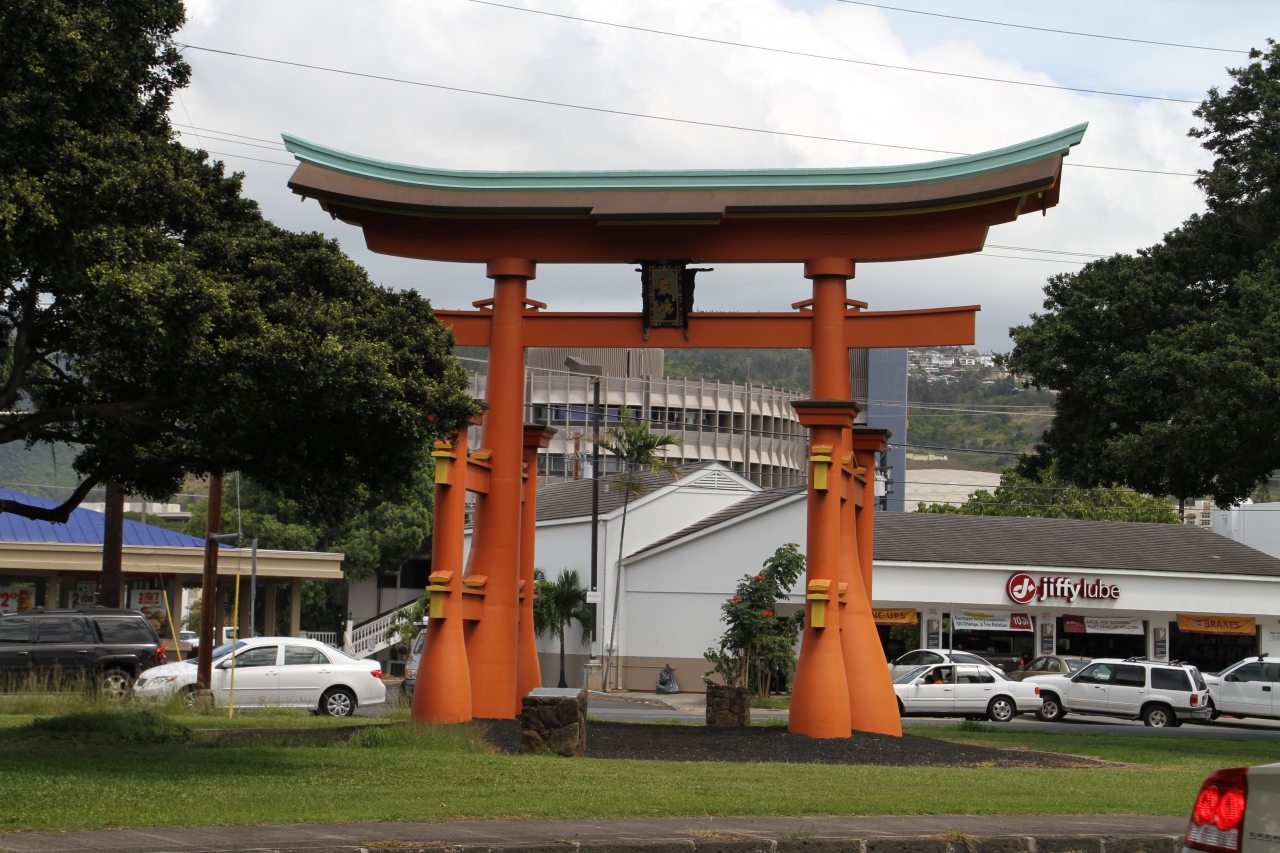 サウスベラタ二アストリートとサウスキングストリートの交叉する近くにこの厳島神社の鳥居だけがあります。近くにはオーガニックスーパーで有名なダウントッアースがあります。また日本人が多く住むと言われているモイリイリの日本カルチャセンターがあることで知られています。この鳥居は今世紀初めに広島市とホノルル市との友好のシンボルとして広島市から送られたそうです。