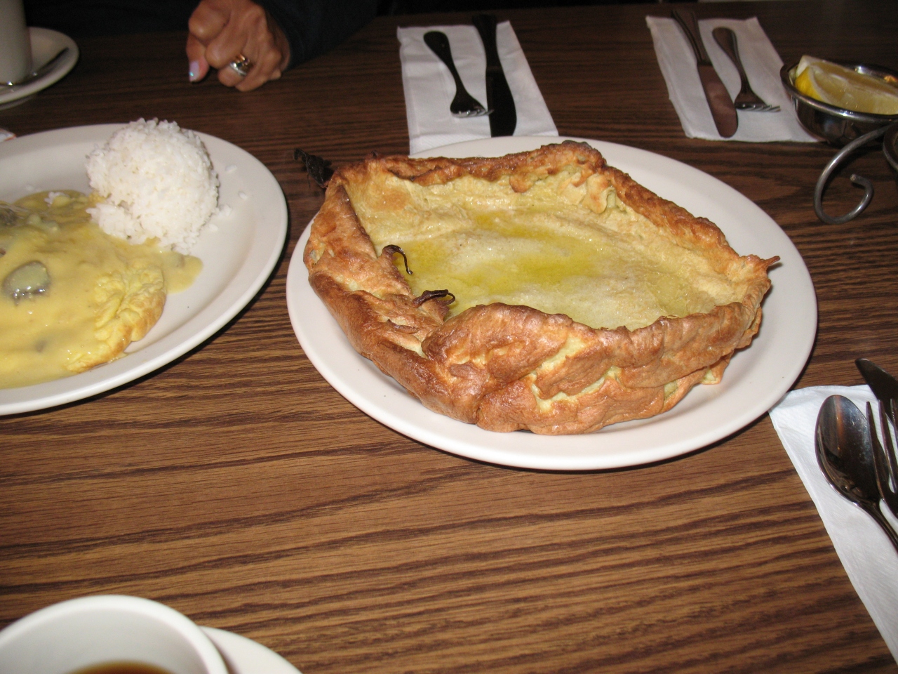 お決まりのダッチベイビーとマッシュルームオムレツ(パンケーキ付)にライスを追加してオーダーしました。ダッチベイビーは20分ぐらいかかると言われ待っているとそれに合わせて他の料理も運ばれてきました。このサービスは高く評価できます。