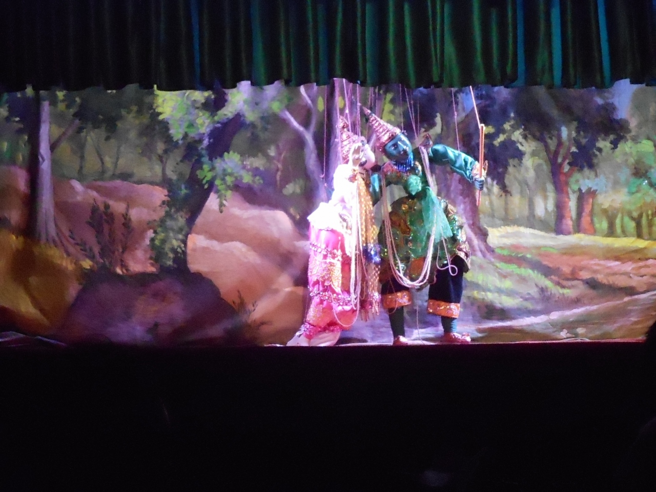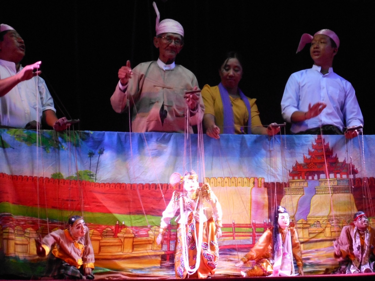 開演時間の8時半に到着しましたが、1人だったこともあり前方2列目に座ることができました。チケット代は1万チャットでミネラルウオーター1本つき。客席の数は50席ちょっと。上演開始時は空席が目立ちましたが、途中から団体客がやってきて9割弱の席が埋まりました。観光シーズンは予約しておいたほうがいいようです。上演時間は1時間で伝統音楽の演奏、子供たちのパフォーマンス、マリオネットの操演と続いていきます。英語での解説が入るので、ある程度の内容はつかめると思います。