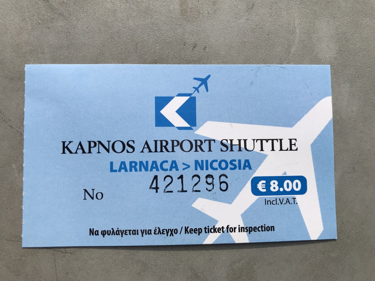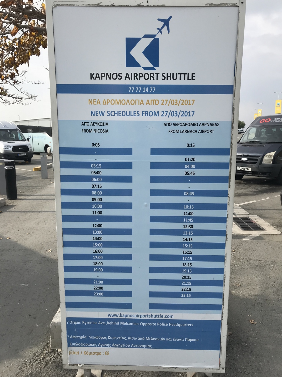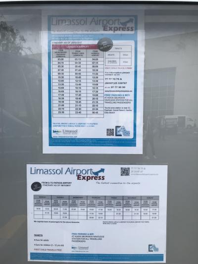 ラルナカ空港からニコシアへのバスは空港出口左側のカウンターでチケットを購入します。料金は8ユーロ。バス会社は違いますが、リマソウル行きのチケットもここで購入が可能です。ニコシア行きはおおむね1時間に1便程度あるようです。ただし、ニコシアのバスターミナルは旧市街から4キロ程度離れています。158番の路線バスに乗るか、タクシー(10ユーロ前後)、もし歩くなら1時間弱かかります。バス乗り場は出口を出たところですが、時間になると係りの人がバスまで案内してくれます。ラルナカ行きの路線バスはここではなく、二階の出発階に上がってからバス停に向かいます。