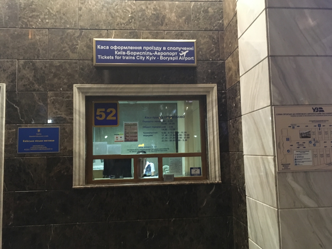 ボリスピリ国際空港とキエフ駅を結ぶ鉄道が営業を開始しました。チケットは駅正面の入口を入ってすぐのところにある52番の窓口で買えます。たくさんの窓口が並んでいるホールでは買えないので注意が必要です。空港へのチケット代は80UAHで14番ホームから列車は出ます。また、ホーム近くにある自動販売機でもクレジットカードで乗車券を購入できるようです。車両は現在1両編成ですが、2019年8月現在はそれほど混んでいませんでした。空港までは40分ほど、バスのような渋滞がないので快適です。