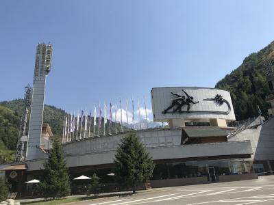 アルマティのカザフスタンホテル前のバス停から12番で30分くらい(150テンゲ)。室内リンクが現れるまでは標高が高く、氷の質が良いこのリンクでスピードスケートンの数多くの世界記録がマークされていました。夏でもリンク内は入場でき、カフェや売店も営業しています。リンク裏の長い階段を登ると、天山山脈の美しい山々を眺めることができます。が、かなり長い階段で、2019年8月現在、途中修復中で通れない場所もあり、車道を歩かなければいけないところもあります。