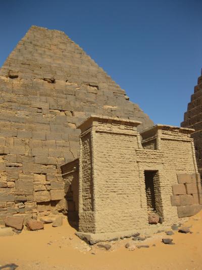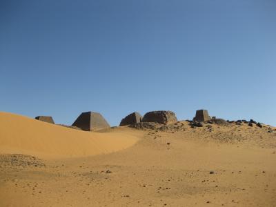 ハルツーム空港から食事、お茶をはさみながら4時間弱で到着しました。途中検問も何度かありますが、夜間だったこともあってスムーズに移動しました。休憩を挟まなければ、3時間かからずにたどり着けると思います。私が訪れた時には観光客はほかに欧米人の個人旅行者が数人、中国人らしきグループ一組だけでした。土産物を売る人やラクダに乗らないかと声をかける人もいますが、しつこくはないです。のんびりした感じで遺跡を満喫できます。ただ、修復したものも多く、それがきれいすぎる(安っぽい)感じがするのは、ちょっと微妙かも。ちなみにここは幹線上にあるので、ハルツームからバスで途中下車するという手段もとれると思います。