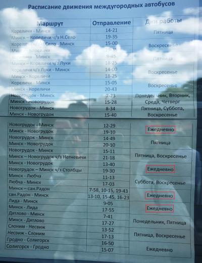 2.0ミンスクへ戻るバスの時刻表はバスを降りたところの建物に掲示されています。この建物、開いているときはバスのチケットを販売しているようですが、閉まっているケースも多...もっと見る