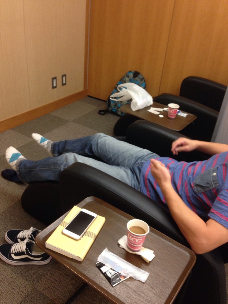 お水、コーヒー、紅茶(この日は試食のスカイツリークッキーもありました)は無料。ブランケット貸し出しもあり、携帯の充電もできます。