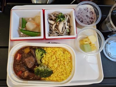 果物は少し固い。初めてのJALでしたが、足元も広いし搭乗口も近くて快適...
