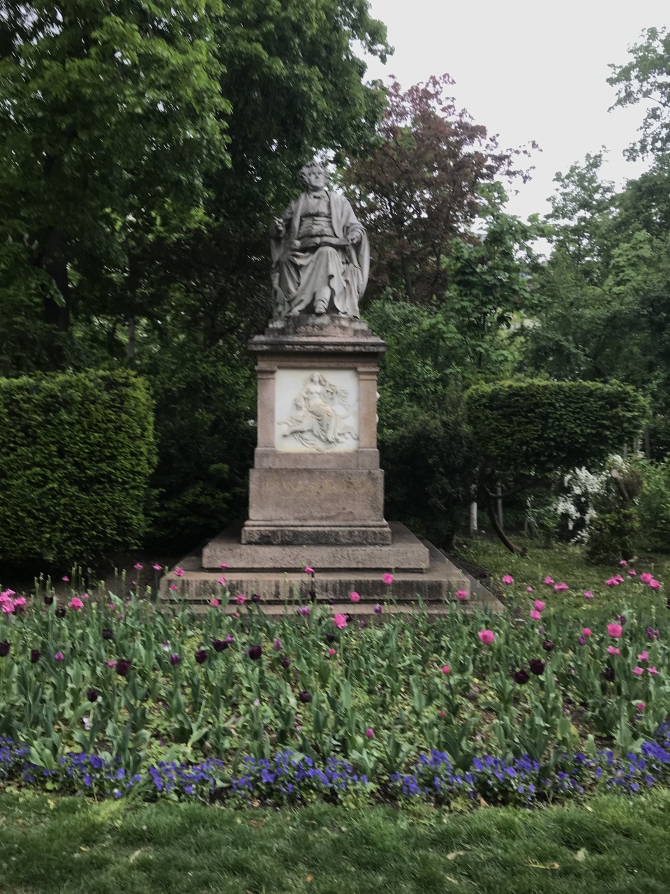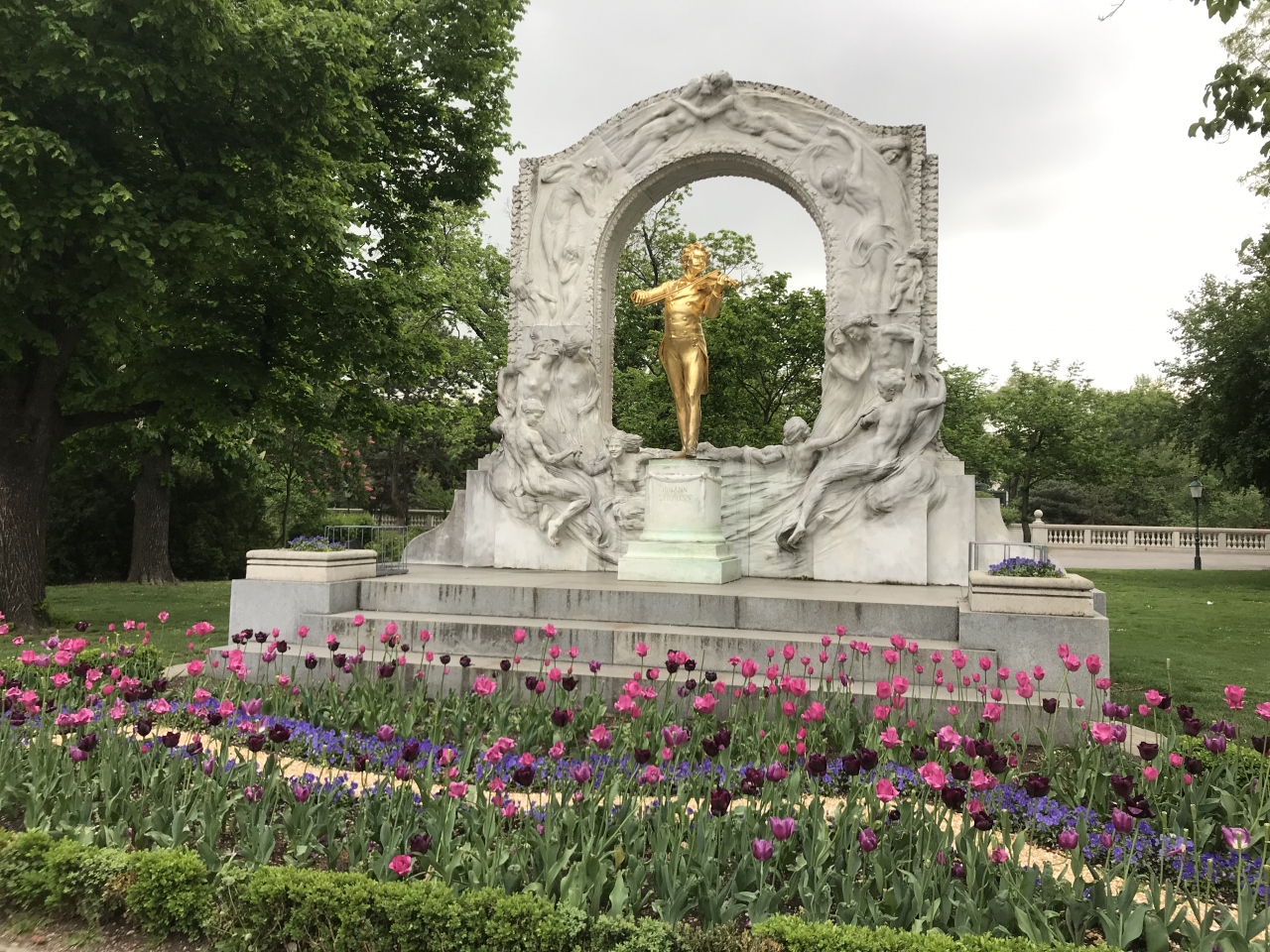 像の前には花畑になっていて、訪れた時期はチューリップが綺麗でした。- 旅行時期