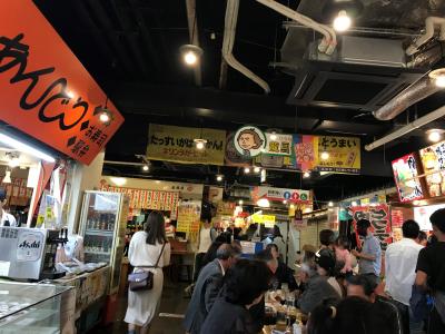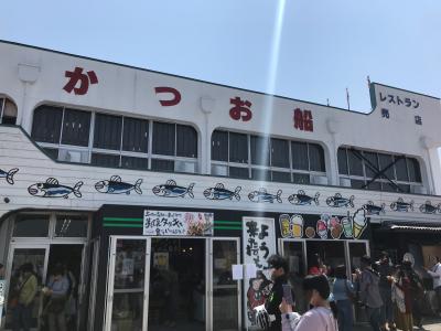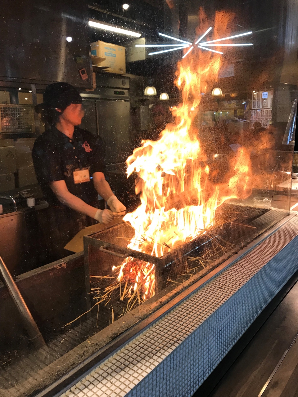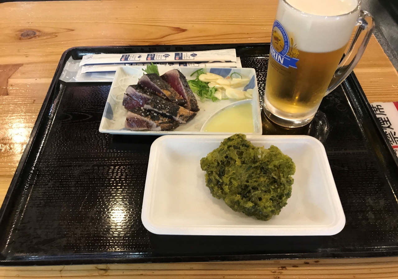 鰹の藁焼きで有名なお店です。たたき小と生ビールセット(1,100円)と青さのりの天ぷら(180円)を注文しました。残念ながら、鰹のたたきは、出来立てを提供されるわけではありませんが、目の前でパフォーマンスが見られるので、迫力満点でした。
