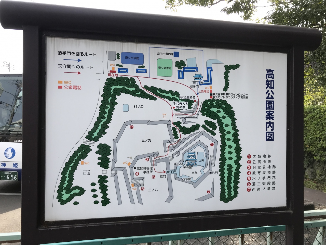 高知城の表門にあたるそうです。門の前に、「国寳高知城」の碑があります。石垣の上に櫓が載っていて、非常に堂々としていました。