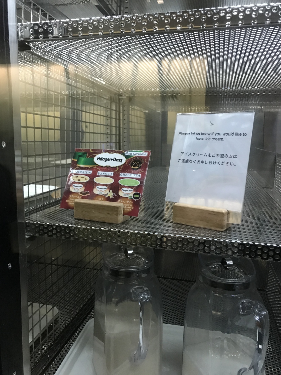 食事は、海苔巻きやパンなどの軽食がありました。カップラーメンは、お馴染みのものに加えて、珍しい海外の商品も置いてありました。アイスクリームは、ハーゲンダッツが3種類(レーズン、バニラ、抹茶)いただけます。
