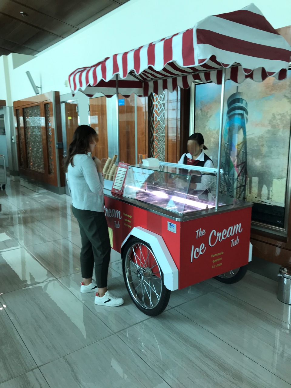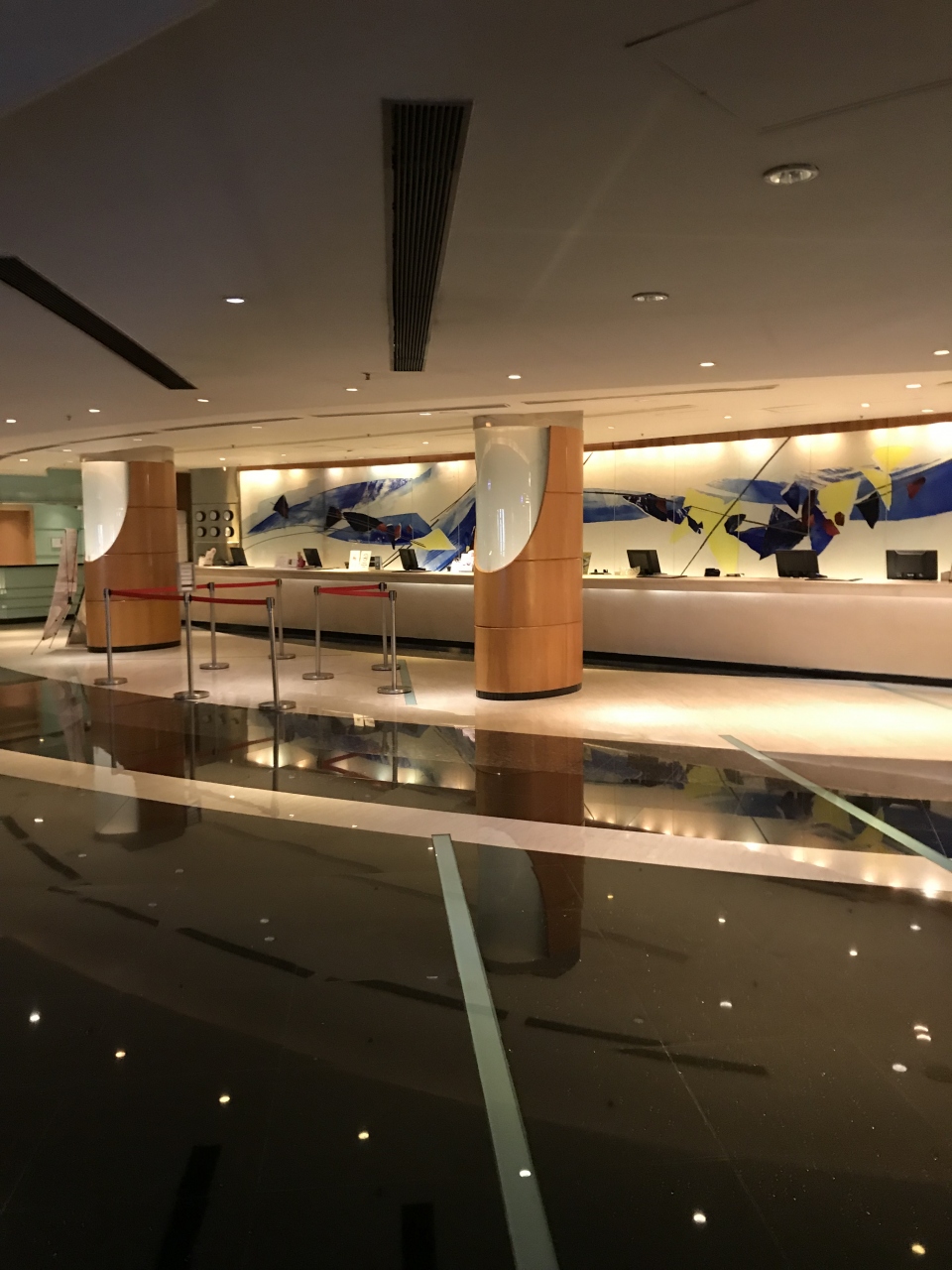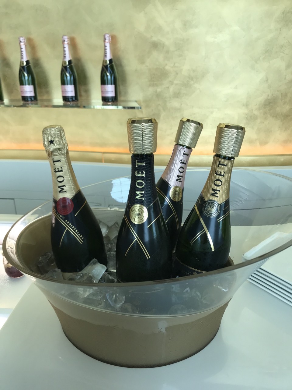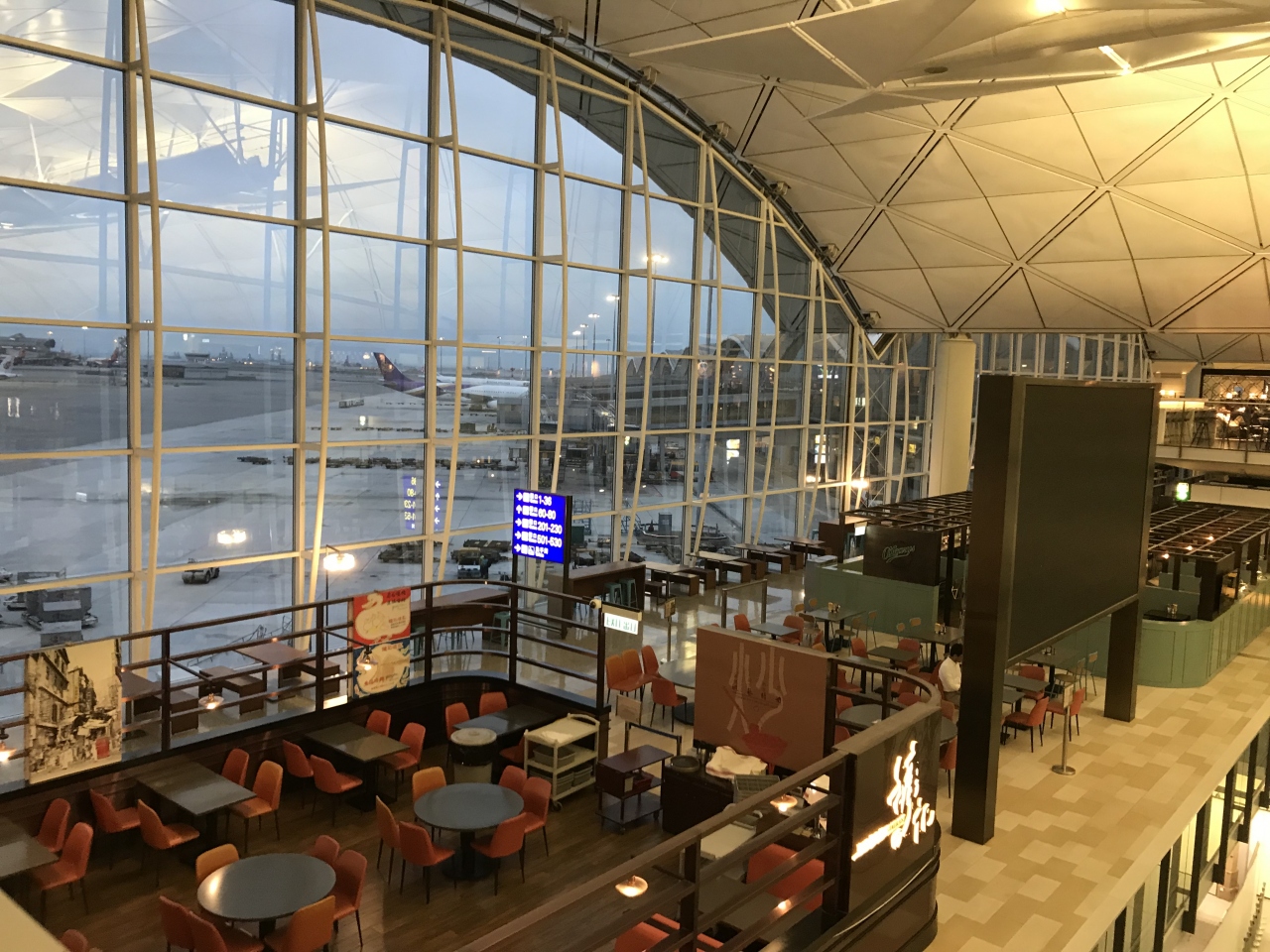非常に広いラウンジです。料理は、アジア料理、西洋料理、カフェコーナーなど、各種類揃っていて、フードコートのようでした。また、シャンパンラウンジがあり、各種モエ・エ・シャンドンが飲み放題でした。子供用のプレイルームもあり、ゲーム機も置かれていました。