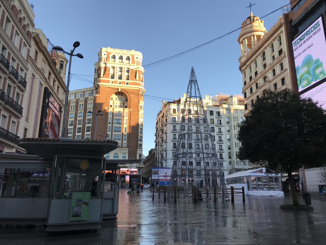 地下鉄カリャオ駅を降りて地上に上がった所です。広場前には、大きな映画館やインフォメーションがありました。すぐ隣に、メインストリートの一つグランビアも走る賑やかな場所です。早朝のため人はほとんどいませんでしたが、大きなクリスマスツリーもあって、人の往来が多い広場だということがわかります。
