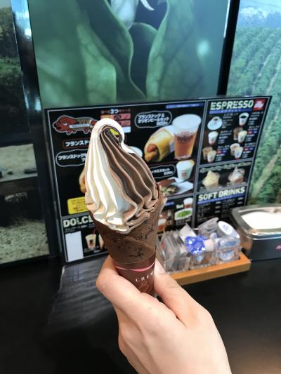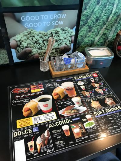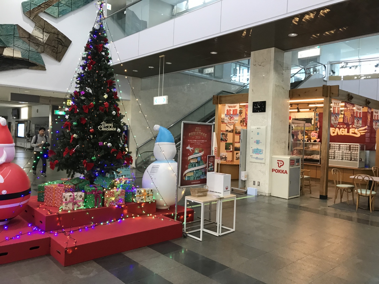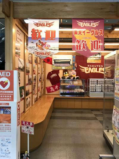 到着も出発も1階でした。1階には、売店が3つ並んでいるほか、蕎麦やアイスクリームが食べられる軽食コーナー、ゲームコーナーがありました。楽天のキャンプ地ということで、楽天の紹介コーナーもありました。