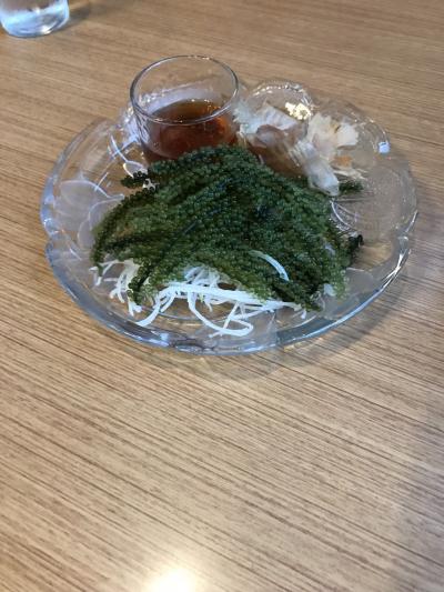 レストランで夕食も朝食もいただきました。夕食は、コースのほかアラカルトメニューもあり、もずくや車海老など地元の名物がいただけます。