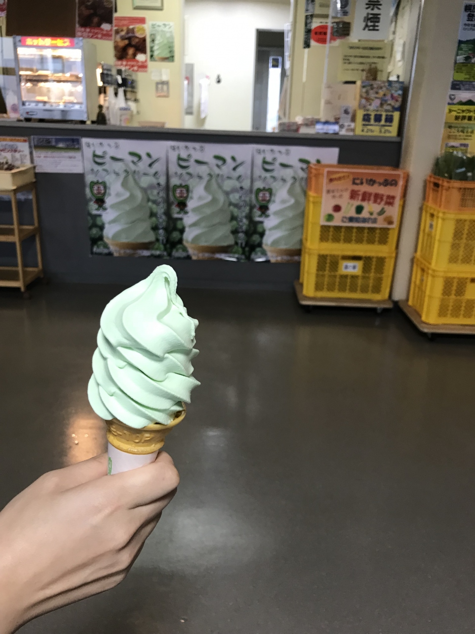 新冠町はピーマンの産地として有名なのだそうです。ピーマン羊羹やピーマンチップスといったピーマンを使った独創的な菓子が販売されていました。そして、ピーマンソフトクリームもあったのでいただいてみました。食べてみると、口に入れた瞬間、確かにピーマンの味。でも甘さもちゃんとあって美味しかったです。