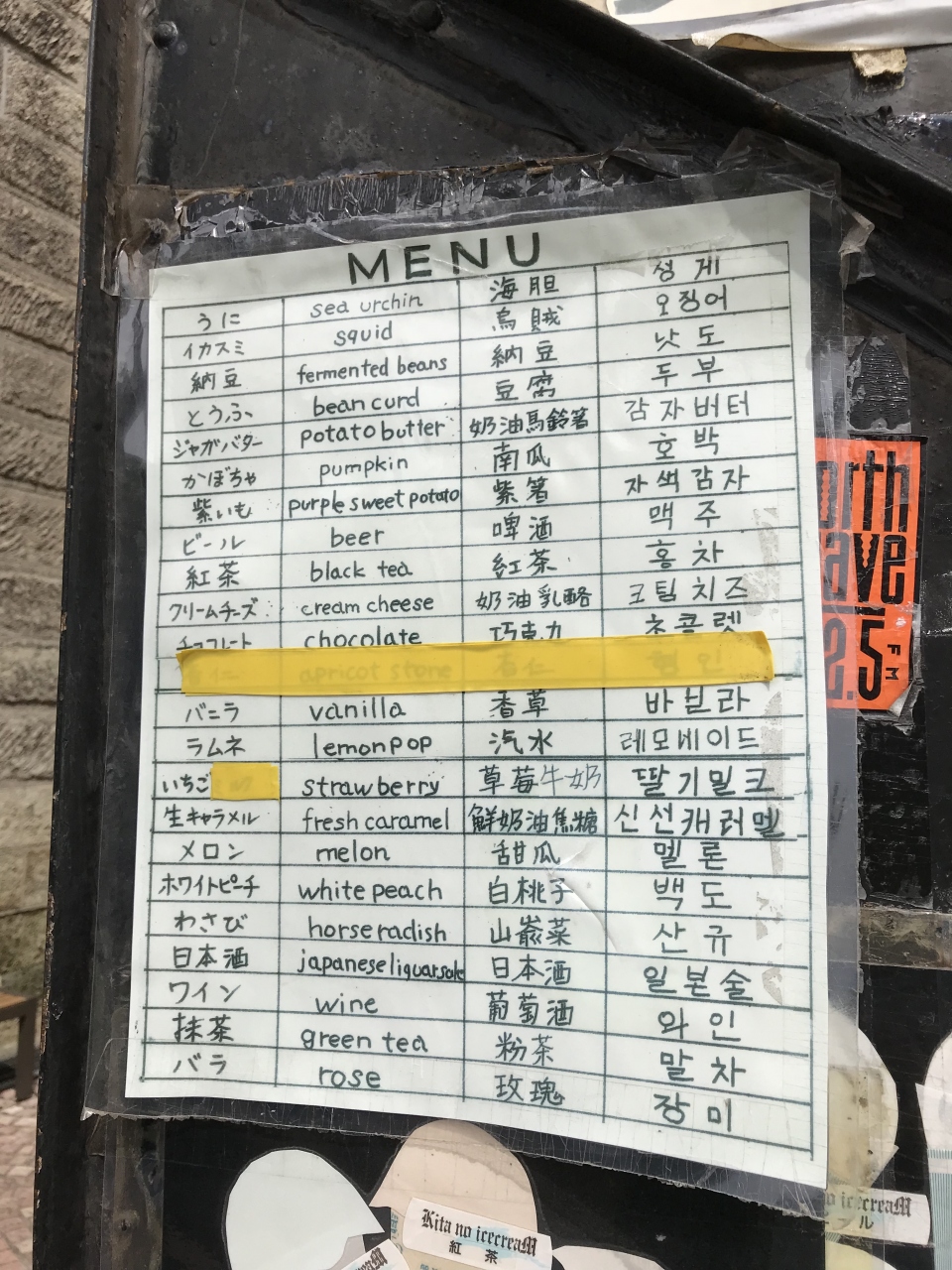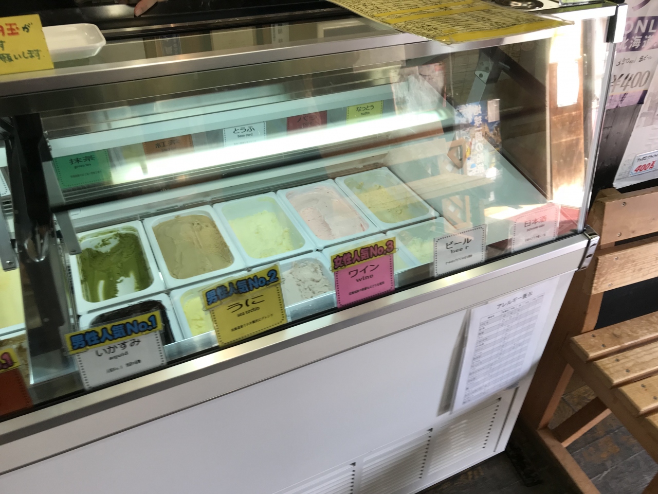 ウニや納豆、イカスミと言った変わり種のフレーバーもあるアイスクリーム店です。バニラやチョコレートなど、オーソドックスな味もあります。