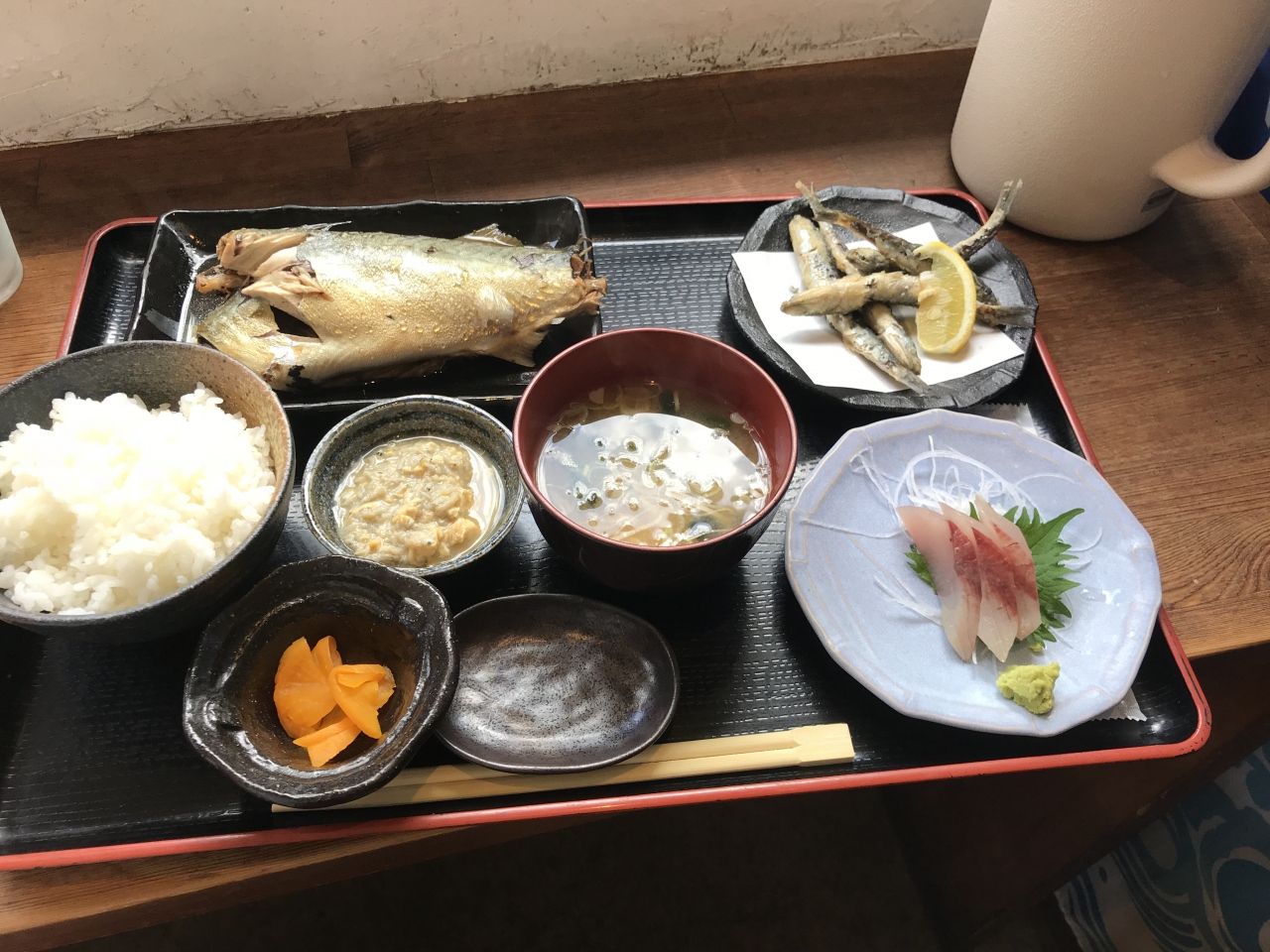 港御膳(1,200円)と本カマス塩焼(1,700円)を注文。どちらにも、刺身や小鉢がセットで付いてきます。値段もそれなりですが、料理のボリュームもかなりありました。