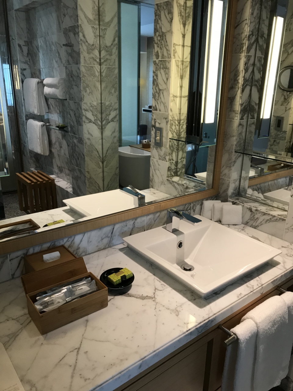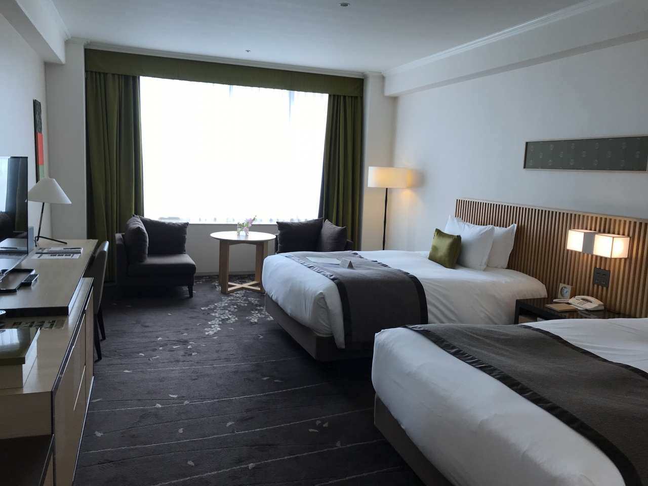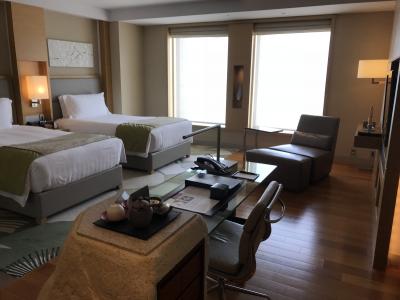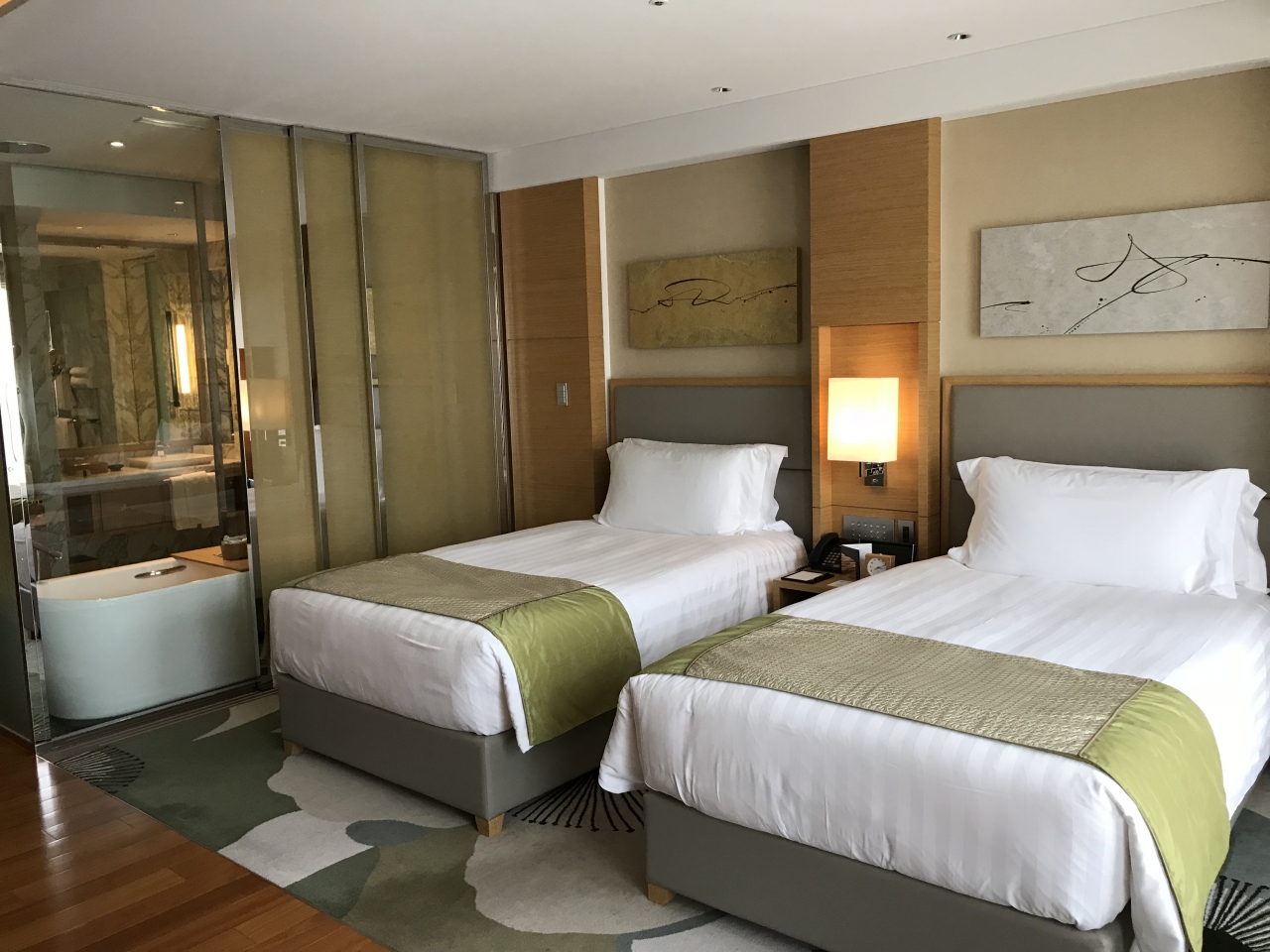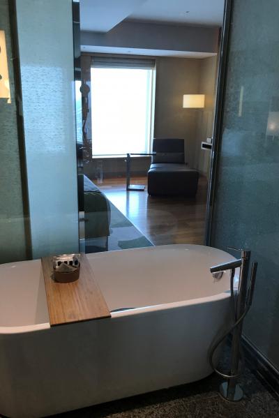 宿泊したのは28階のクラブインターコンチネンタルツインルームでした。バスルームからも外が見えるなど、スタイリッシュなデザインの部屋でした。部屋からは大阪城も見えて眺望は良かったです。
