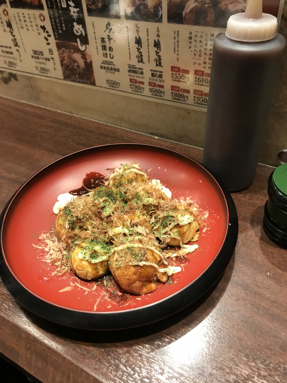 たこ焼き8個(680円)を注文しました。注文すると、ほとんど待たずに提供されました。ソース、マヨネーズ、青海苔、鰹節は、自分でお好みの量をかけていただきます。ふわふわのとろとろで美味しかったです。- 旅行時期
