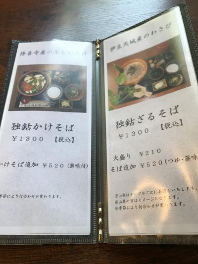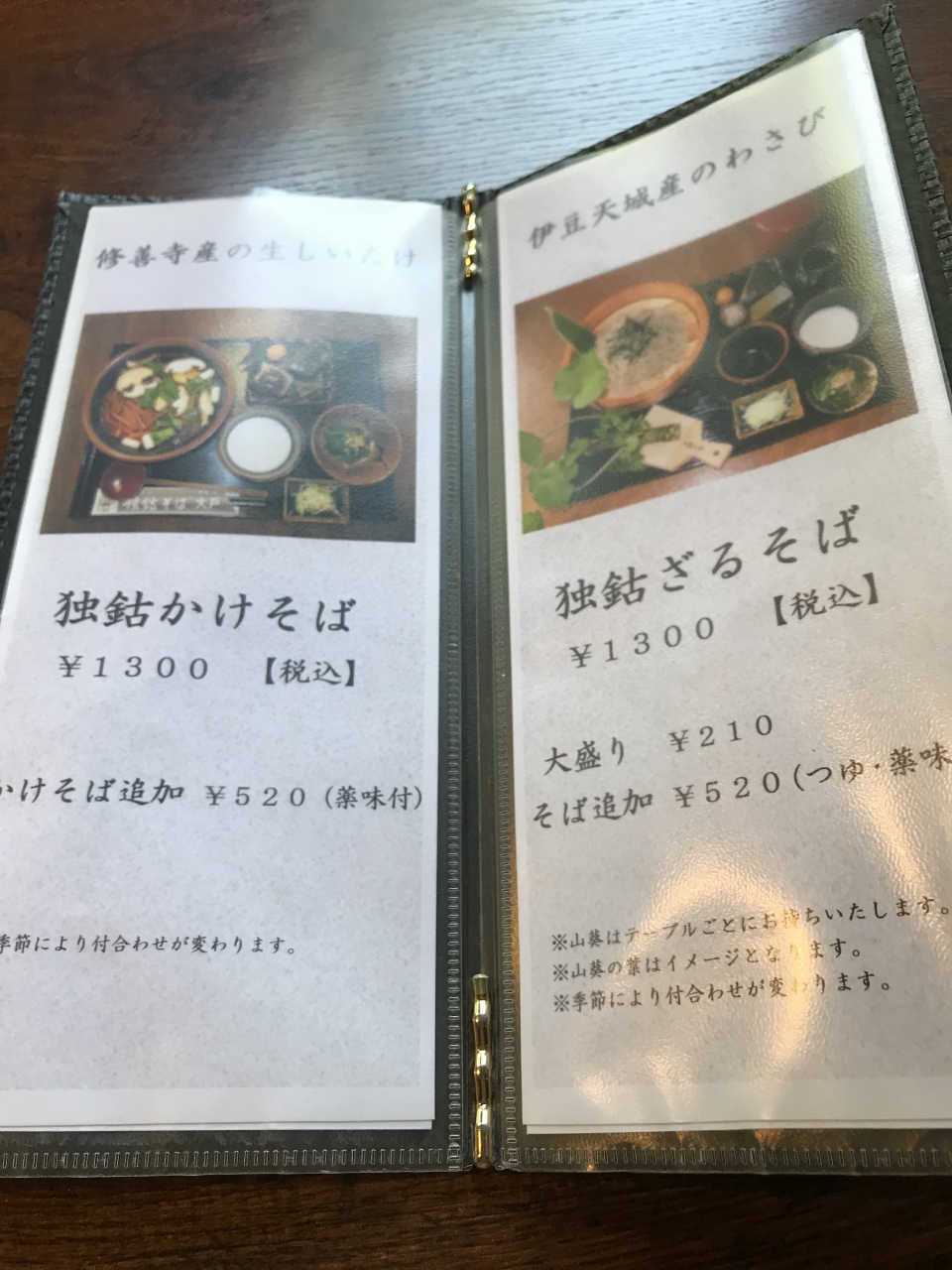 かけそばの売りは、地元修善寺産の椎茸で、ざるそばの売りは伊豆天城産のわさびとなっています。