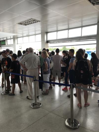 空港では、乗り場にある自動受付機で番号札を取るシステムでした。