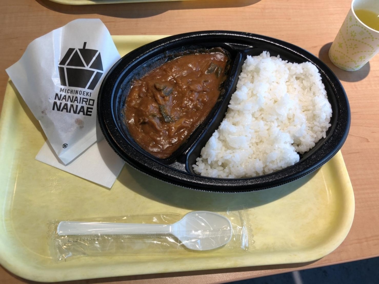 道の駅なないろななえ内にあって、コロッケ、アイスクリームなどのほか、カレーが食べられます。北の匠長ネギカレーと黒いカレー、王様椎茸コロッケを注文しました。黒いカレーにはイカが入っています。王様椎茸コロッケは、道の駅内でも販売されている特産品の王様椎茸を使ったもので、椎茸がゴロゴロ入っていました。