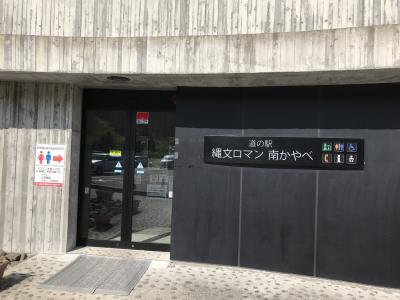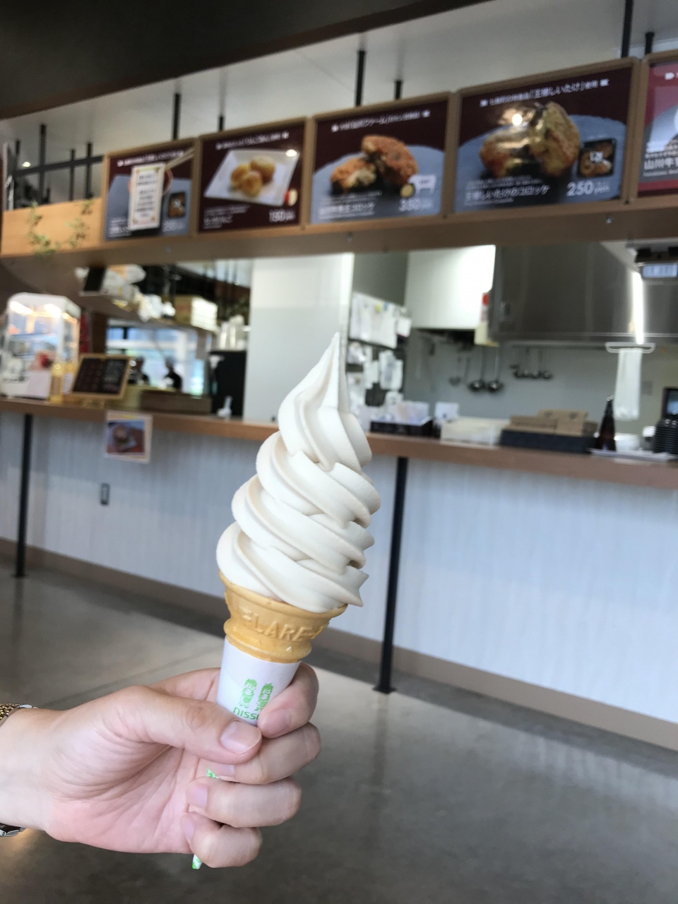 このあたりで大規模な縄文遺跡が発掘されたそうで、それにちなんだ道の駅になっています。売店は小さめで、縄文文化にちなんだ商品が販売されていました。その中の一つ、じょうもんくるみソフトをいただきました。くるみを練りこんだソフトクリームに、くるみパウダーがかかっています。