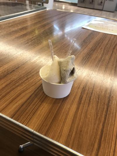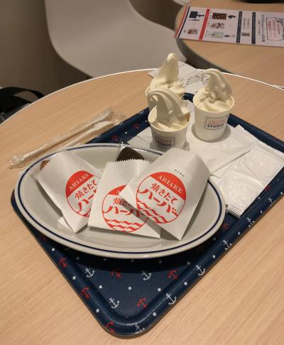 横浜ハンマーヘッドの2階です。ここでは焼き立てのありあけハーバーがいただけます。焼き立てのありあけハーバーは、ロイヤル、ダブルマロン、ガトーショコラの3種。せっかくなので、一つずつ全ていただきました。プレーンのソフトクリームに加えて、限定のハーバーソフトも気になったので追加注文。ソフトクリームにありあけハーバーが練りこんであるもので、食感がおもしろくて、もちろん美味しかったです。