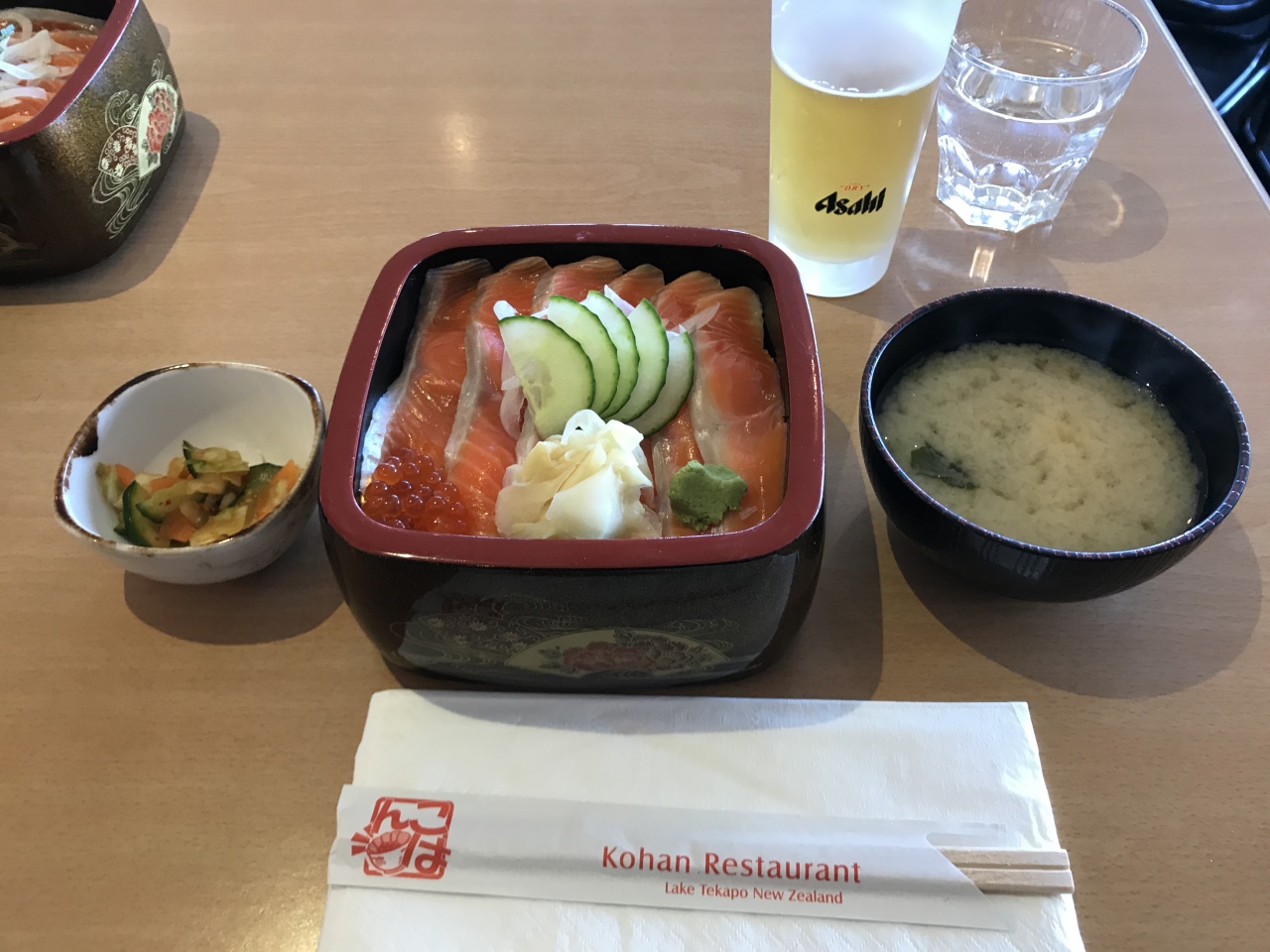 名前の通り湖畔にあり、店内から見えるテカポ湖が美しいです。ディナーで利用しました。夜の営業開始時間(18:00)の少し前にお店に行ったら、既に何人かが並んでいました。予約者が優先ですが、予約していなくても開店前から並べば、開店と同時に入店できました。店員さんは、日本人の方も多いです。名物のサーモン丼は、23NZD。日本で食べる日本食と変わらない味で美味しかったです。店頭にはメニューのサンプル、お茶は無料とサービスも日本式でした。
