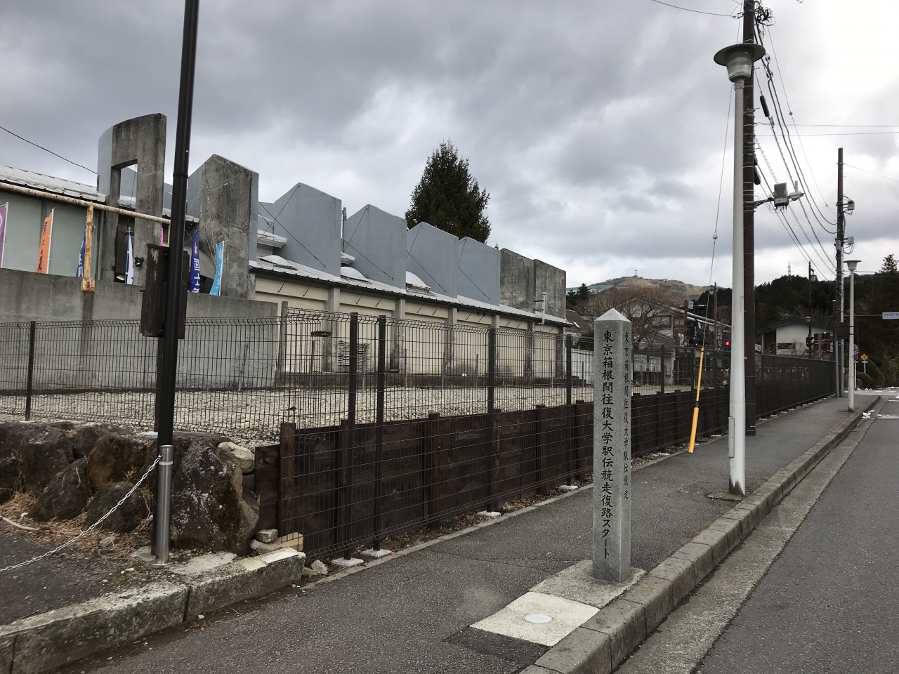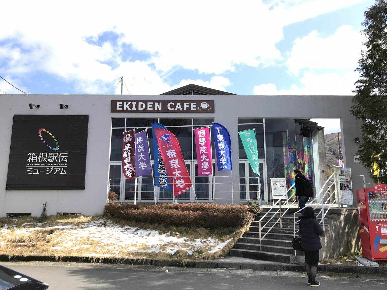 ミュージアムの前が、箱根駅伝の往路ゴール、復路スタート地点になっていて碑が建てられています。入口には出場各校の旗がたなびいているので、目印になってわかりやすいです。