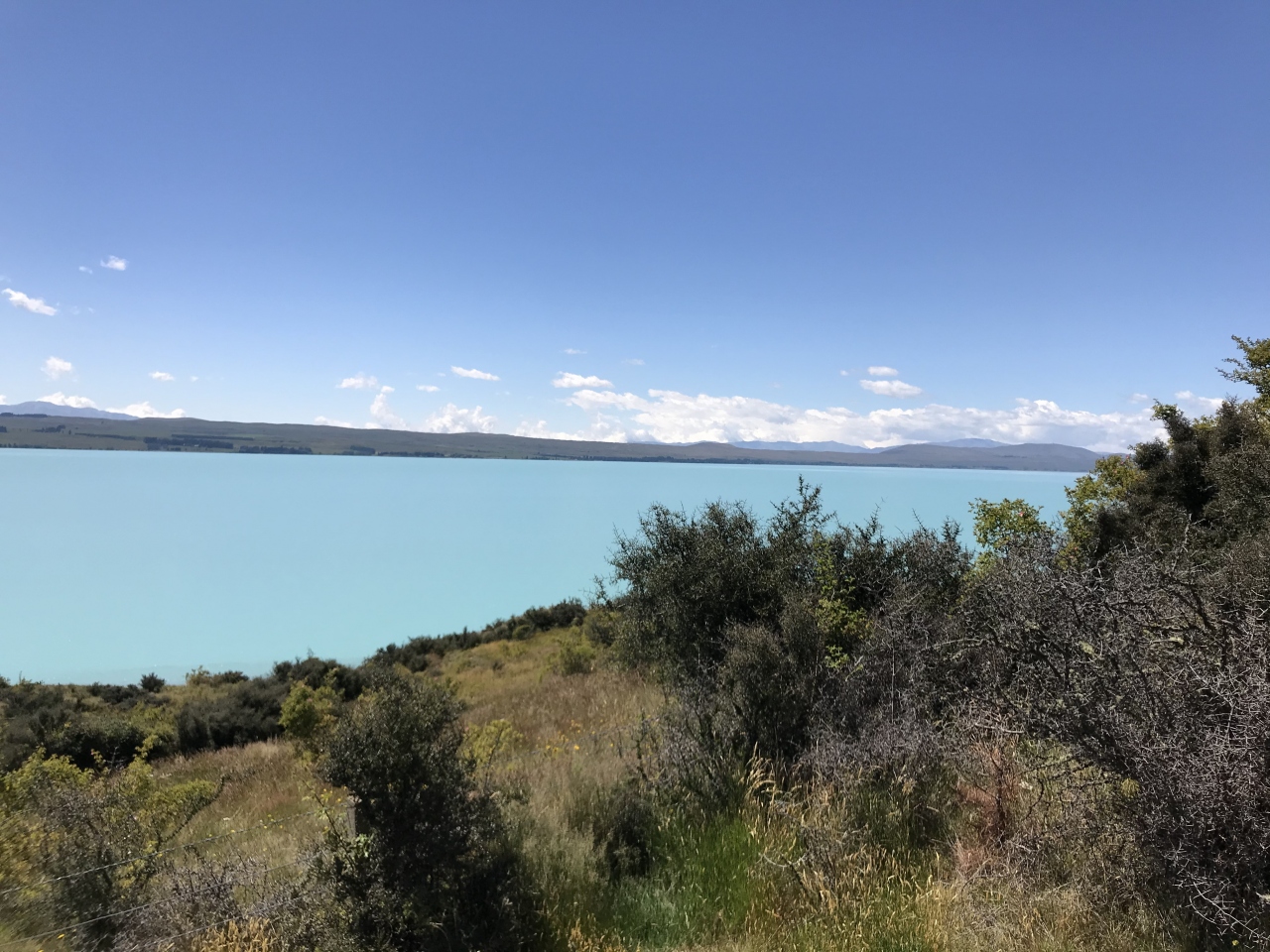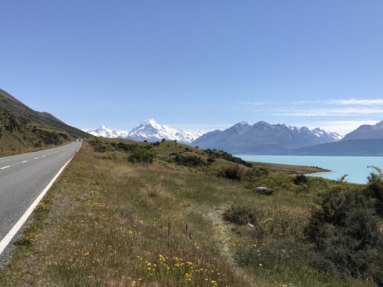 マウントクックの麓にある南北に長い湖です。マウントクックに向かう途中、ずっと湖沿いを走りました。近くにあるテカポ湖が有名ですが、このプカキ湖もテカポ湖と同じくミルキーブルーの色をしていて、とても美しいです。また、マウントクックとプカキ湖を一緒に見ると、とても絵になる光景でした。