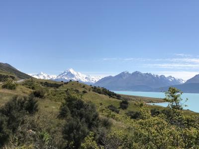 ハーミテージホテルを起点に、雄大な景色を楽しみました。当日は、快晴だったので、アオラキ/マウント・クックが山頂まで見えて、山の形まではっきりとわかりました。万年雪に覆われているため、夏でも真っ白です。とにかく雄大な景色で感動しました。