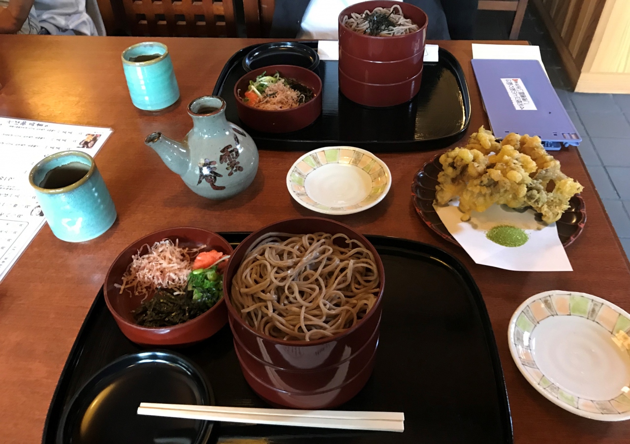 名物の割子そばを注文し、舞茸の天ぷらを追加しました。割子そばの定番のセットは3枚、その他4枚5枚もあるのでたくさん食べたい場合はそちらを注文すると良いと思います。割子そばの食べ方は独特で、蕎麦に直接濃いめのだしをかけていただきます。