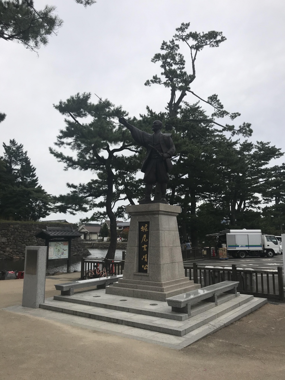 台座や像などを見ると、まだ新しい印象を受けました。松江城の天守に向かって建てられていて、右手を高く掲げて、大きな志が感じられる像でした。- 旅行時期