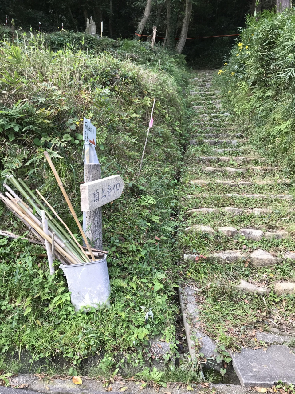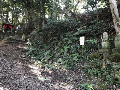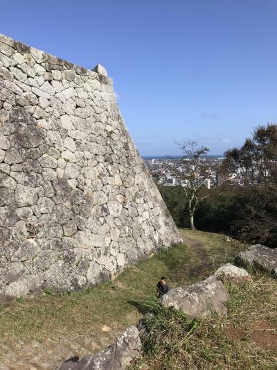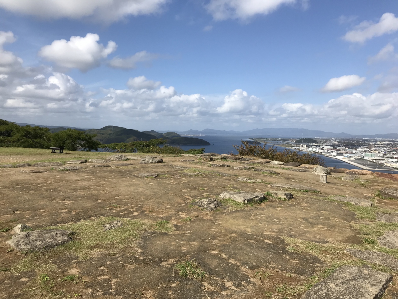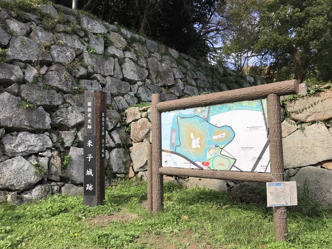 建物は残っていないものの、石垣などがそのまま残っていて、当時を偲ぶことができます。そして、天守があった頂上まで上ることができて、頂上からの眺めが素晴らしかったです。頂上までは急な石段を上るので、結構大変でしたが、頑張って上るだけの価値はあると思います。入口には杖替わりの棒もありました。