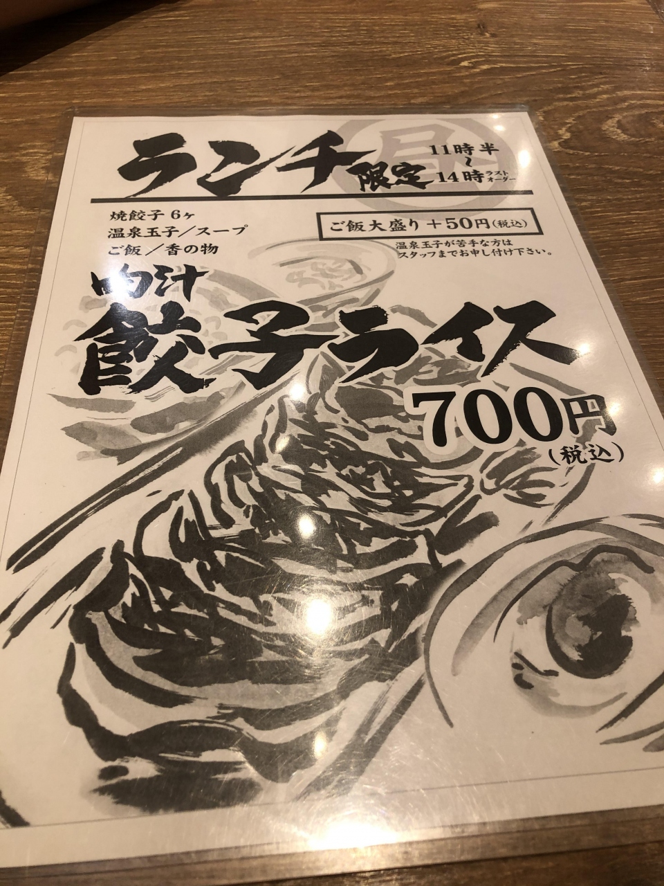 ランチで利用しました。1種類だけですが、ランチメニューもありました。餃子にご飯とスープなどが付いて700円です。餃子は肉汁がたっぷりで、皮はもちもちで美味しかったです。何も付けなくても、しっかり味が付いていました。また、夜の時間帯にも利用してみたいと思いました。