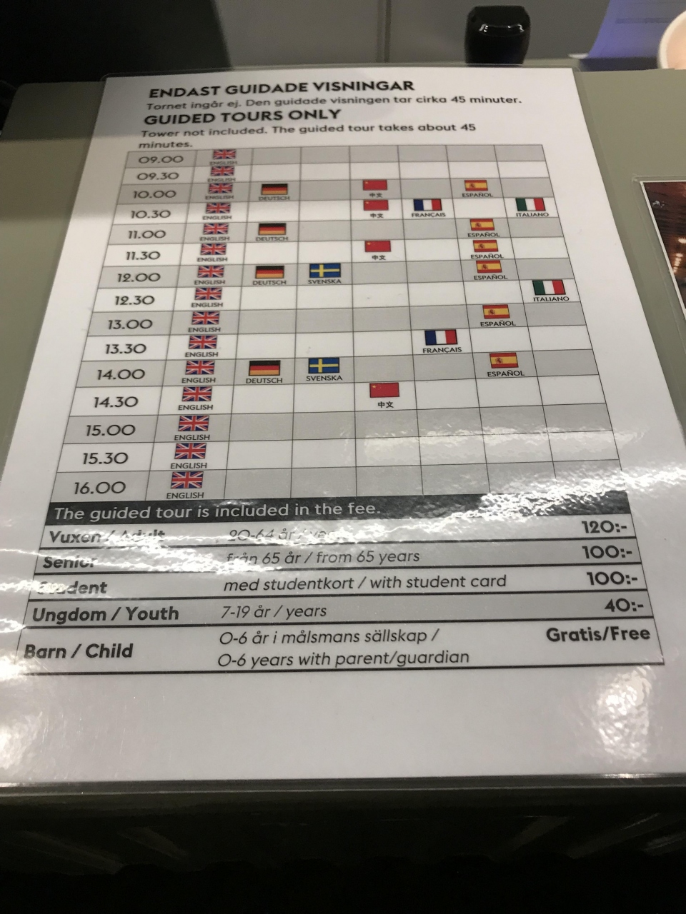 また、市庁舎のもう一つの見どころであるはタワーは別料金(60kr)です。定員制で、希望の時間に上れないこともあるので、予約だけでも先にした方が良いと思います。途中まではエレベーターがあり、最後は階段で上ります。ストックホルム市内を一望できて、お勧めです。- 旅行時期