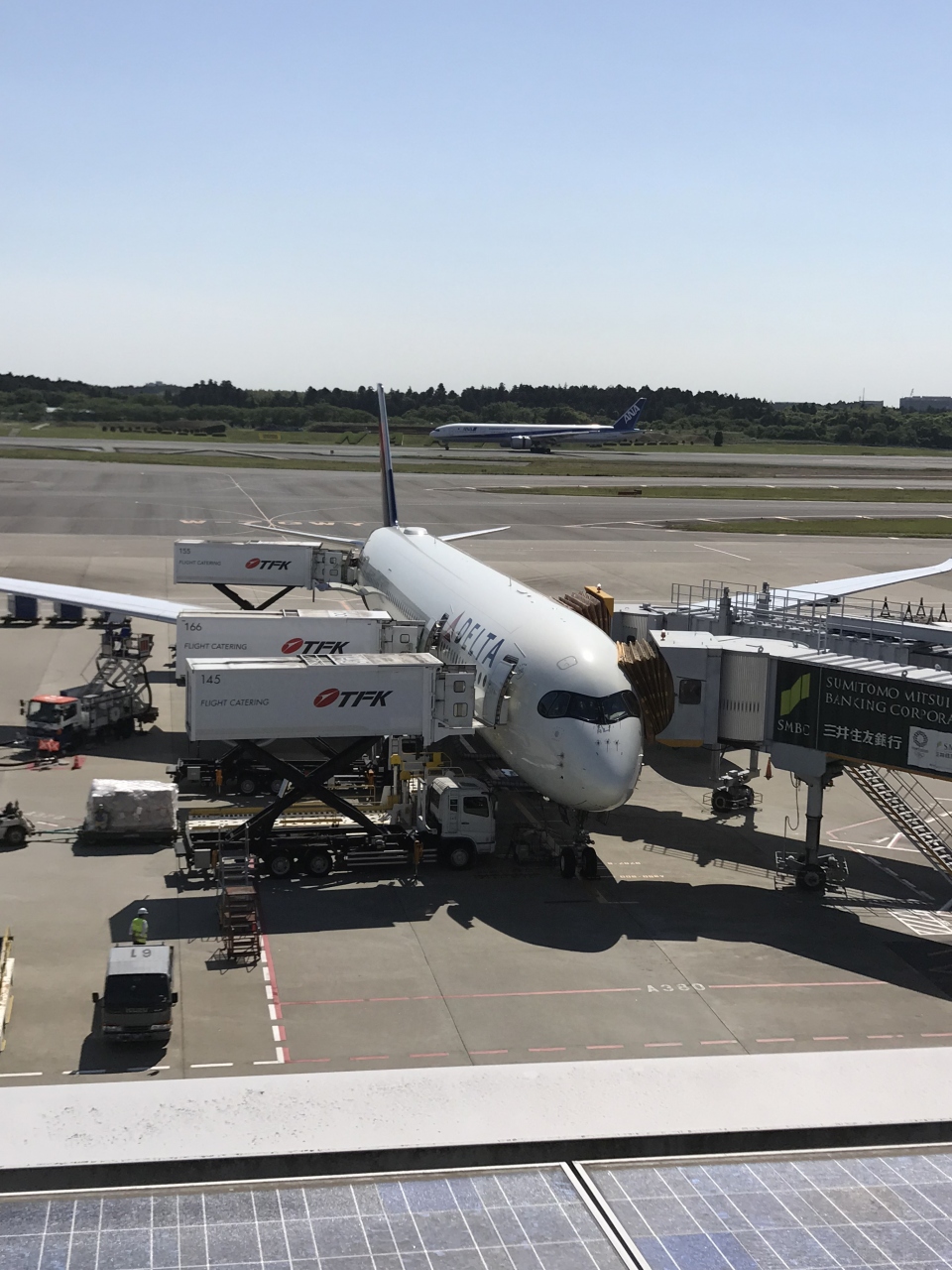 駐機している飛行機や、飛び立つ飛行機の様子を間近で見ることができます。第1ターミナルは、日本の大手航空会社だとANAが見られます。そのほか、この時はアエロメヒコ航空やデルタ航空が見られました。