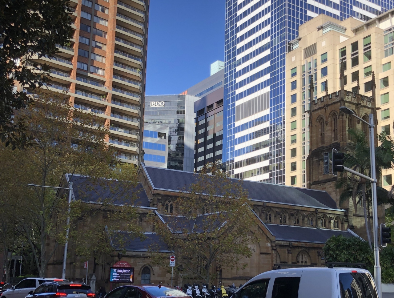 ヨークストリート沿い、ラングパーク前にある教会です。大きな教会で、特に塔が立派な堂々とした建物でした。周辺はオフィス街で、近代的なビルに囲まれているので、古いレンガづくりの教会が一際存在感がありました。