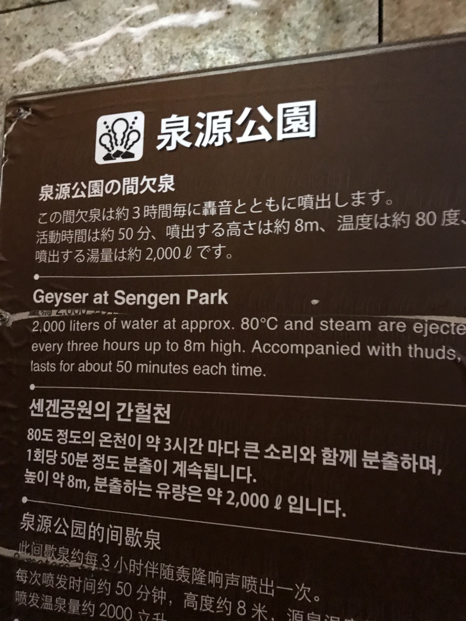 約3時間ごとに数メートルの高さまで勢いよく噴き出す間欠泉が見られるそうです。そのタイミングではなかったものの、湯気がモクモクと噴き出ていて、音もゴーゴーと聞こえて、迫力が凄かったです。周囲には色とりどりの鬼のこん棒のモニュメントがあり、それぞれ違ったご利益があるそうです。