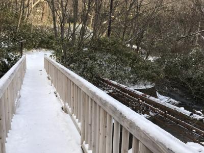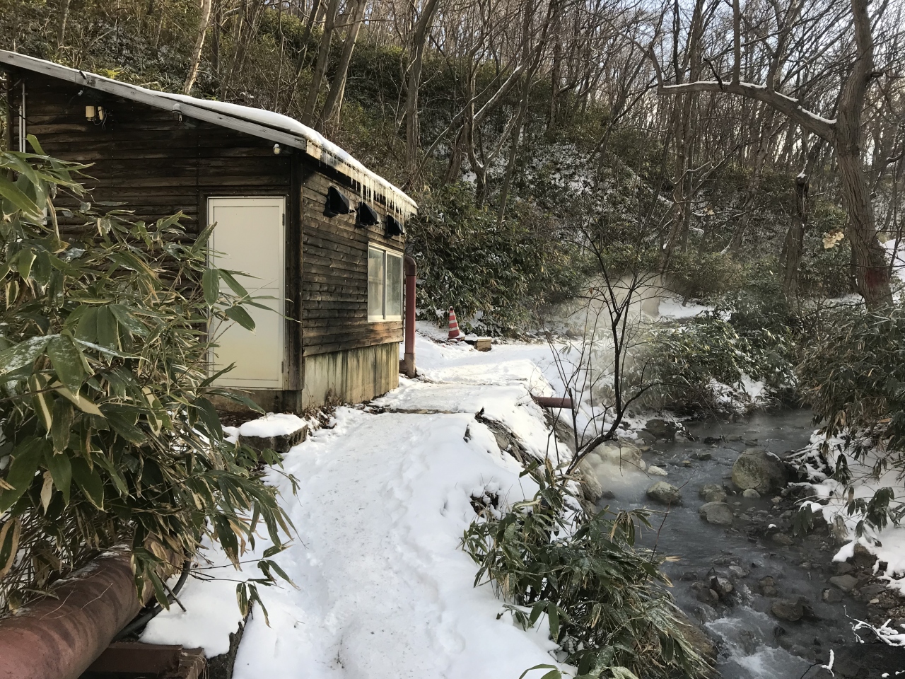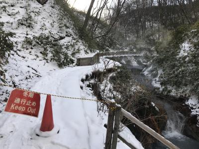 「石水亭」の裏からスタートしました。自然豊かで散策も気持ち良いです。ただ、冬だったので、雪のため滑りそうで、少し怖かったです。冬季は歩ける範囲が限定されます。天然足湯のあたりまでしか行けませんでした。その先は通行止めになっていました。