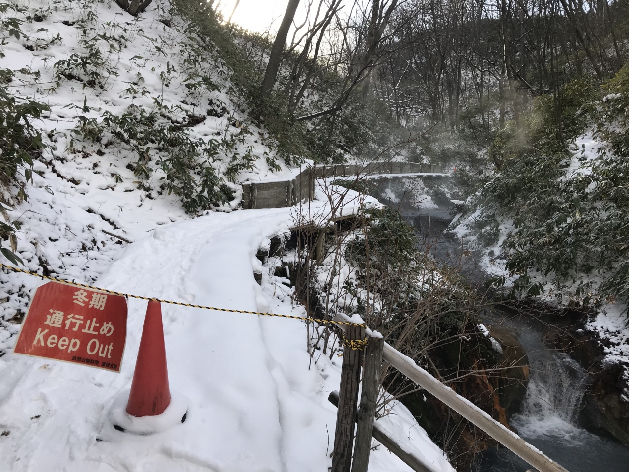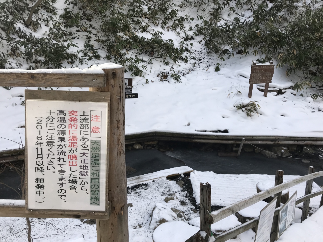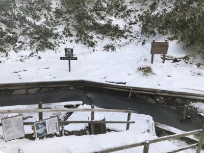 地獄谷・大湯沼自然探勝路の途中です。川に大湯沼から溢れ出した温泉が流れ込んで、天然の足湯になっています。足場なども整備されて、足湯を楽しめます。手を付けてみたら、温度はそれほど熱くなかったです。ただ、突発的に源泉が流れ込むことがあるので、注意が必要とのことでした。