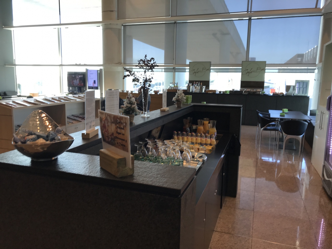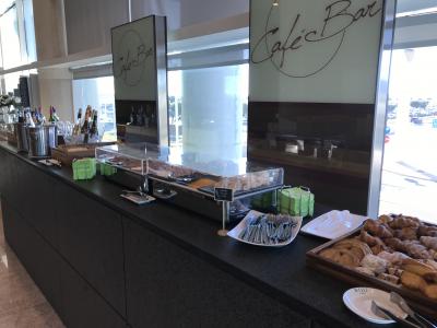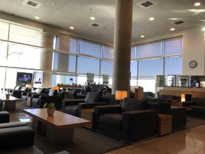 場所は、ゲートA2の前です。Aゲートをひたすら歩いた突き当たりにあります。それほど大きなラウンジではありませんが、ドリンクの種類は豊富でした。食事はホットミールは無く、サンドイッチ、パン、ヨーグルトなどの軽食がありました。生ハムもあり、充分な品揃えだと思いました。充電スペースは、ほとんどなかったです。空いていたので、寛げました。