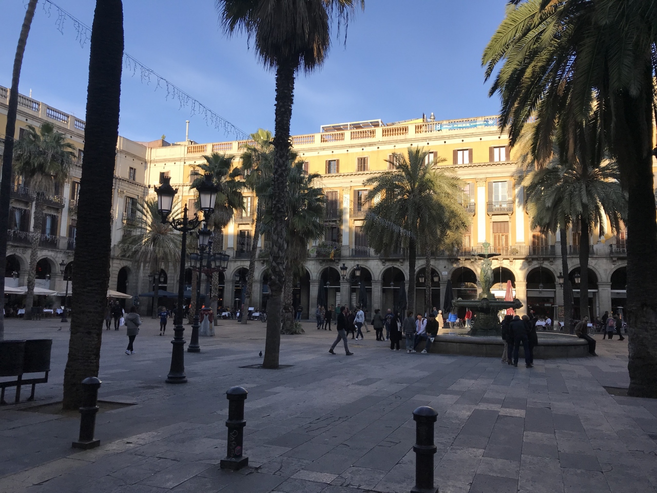 周囲は建物に囲まれていて、広場の真ん中に噴水があります。ガウディがデザインした街灯があることで有名です。ガウディが建築学校を卒業したばかりの頃のものだそうです。街灯は噴水を挟むように2つ設置されていました。