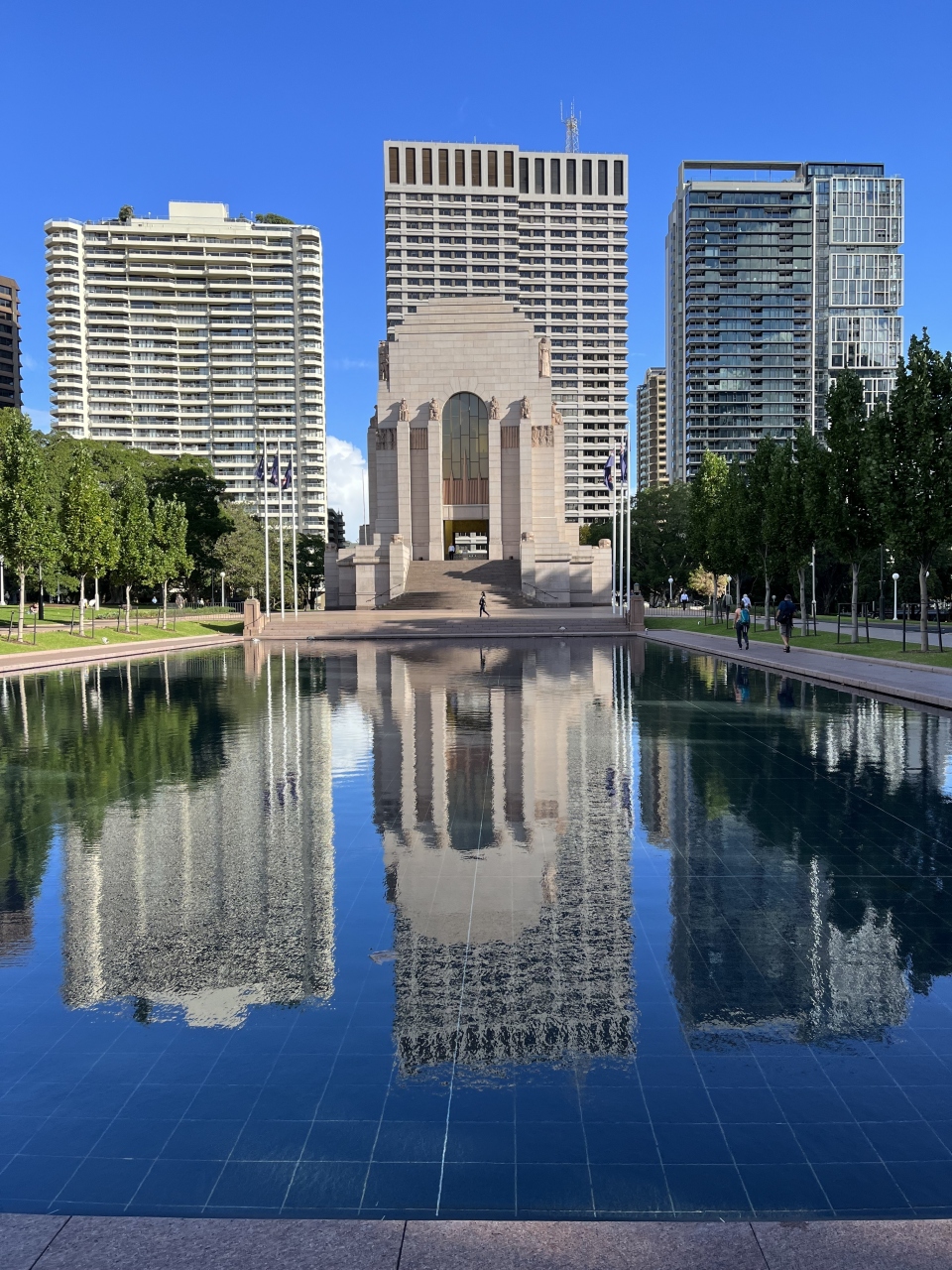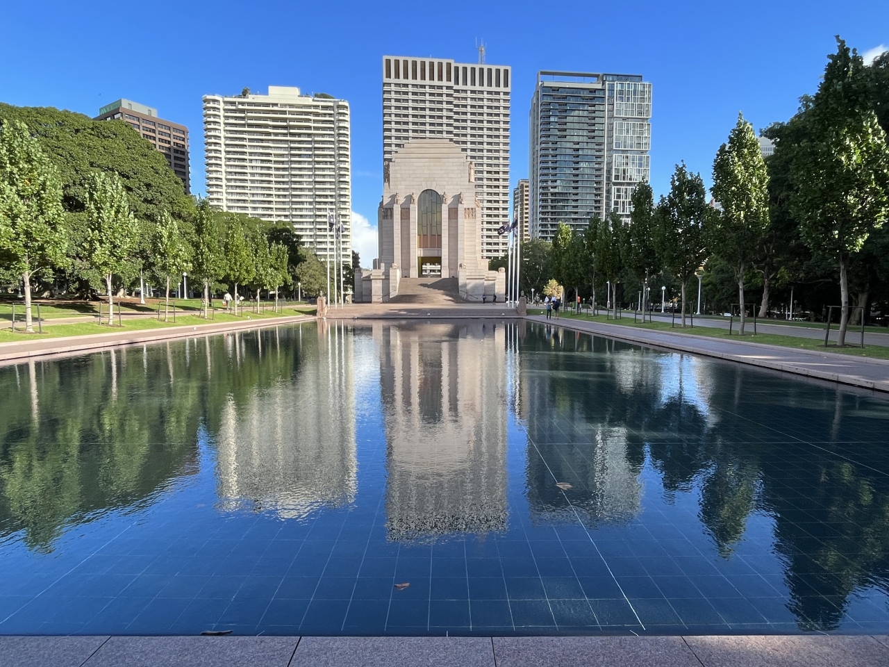 アンザック戦争記念塔の前にある人工的な池です。記念塔の南側にあります。入って遊ぶようなものではなく、専ら観賞用でした。広いプールの水にはアンザック戦争記念塔が綺麗に映り込んで、セットで見るととても美しいです。